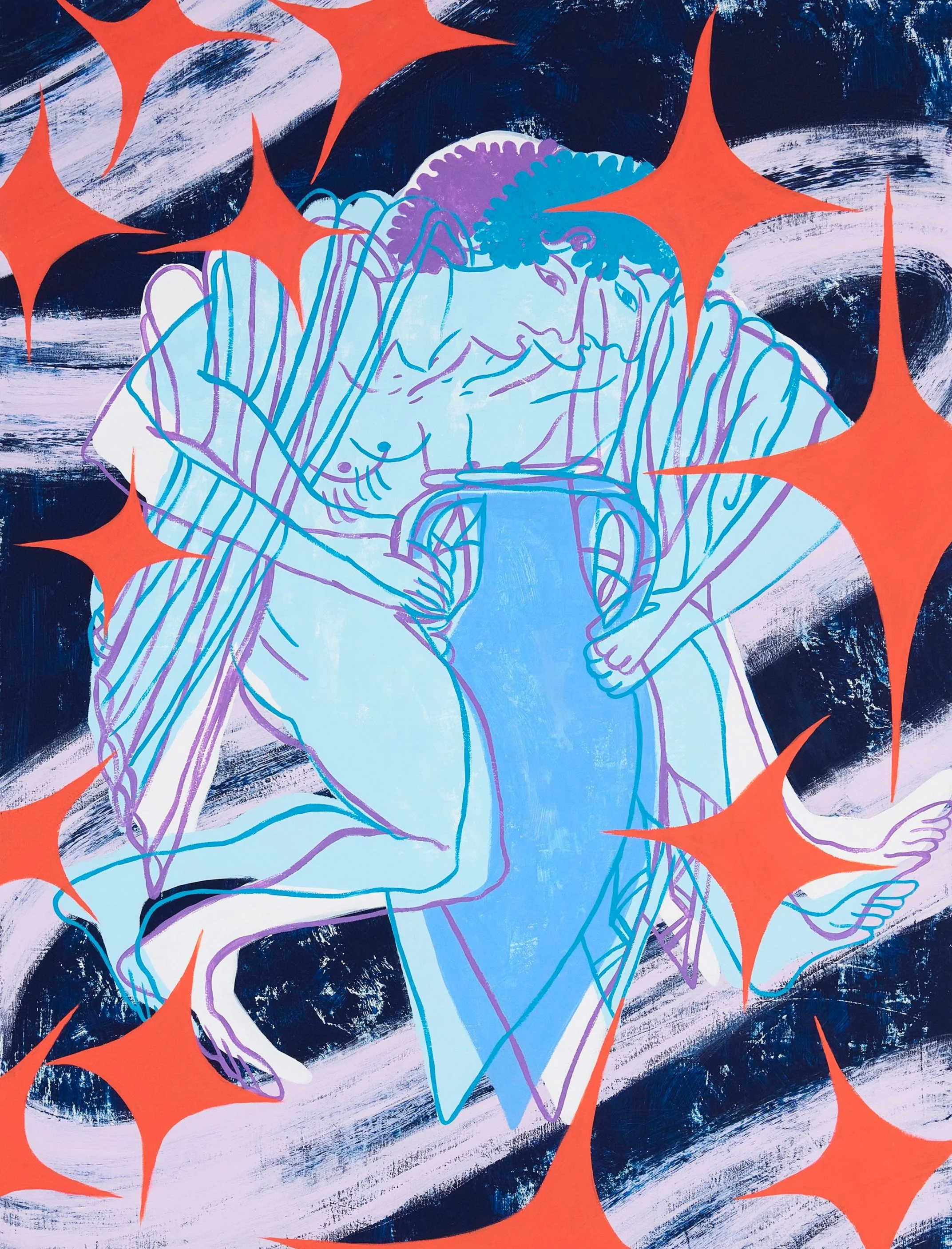 Sprawling in their range of references, the works of artist Alexei Mansour displayed in Becoming a Vessel harnesses the visual grammar of Greco-Roman Antiquity in order to explore the fluid, amorphous nature of queerness and subjective identities. The paintings and drawings exhibited here offer visions not of a static past shrouded in myth and legend, but an exuberant otherworld of symbols that both mirror and transform visual cultures of the classical past into present realities. Rendered in kaleidoscopic color, archetypal figures are set in a backdrop of Arcadian vegetation which frame a Dionysian vision, inviting viewers into the heterotopia that these figures inhabit. Among the multiplicity of bodies and vessels alike, figures intertwine and mirror the once secret works of British artist Duncan Grant (1885–1975) that also appear in the exhibition, adding another layer to the representation of eroticism made visible in queer history. Mansour’s talismanic works offer reminders of the queer homosociality of Antiquity and ask viewers to imagine themselves as corporeal vessels, self-reflective containers filled with their own history. Becoming a Vessel portrays the artist’s personal journey to find a sense of belonging. However, his work emphasizes that this universal voyage has no final destination. Rather, Mansour’s interrogations of sexuality, representation, and identity through symbols and bodies represent these struggles as ongoing transformations. The promise of multiple, fluid ways of being in the world, each coaxing the viewer, and one another, to remember who they once were and imagine who they might become.